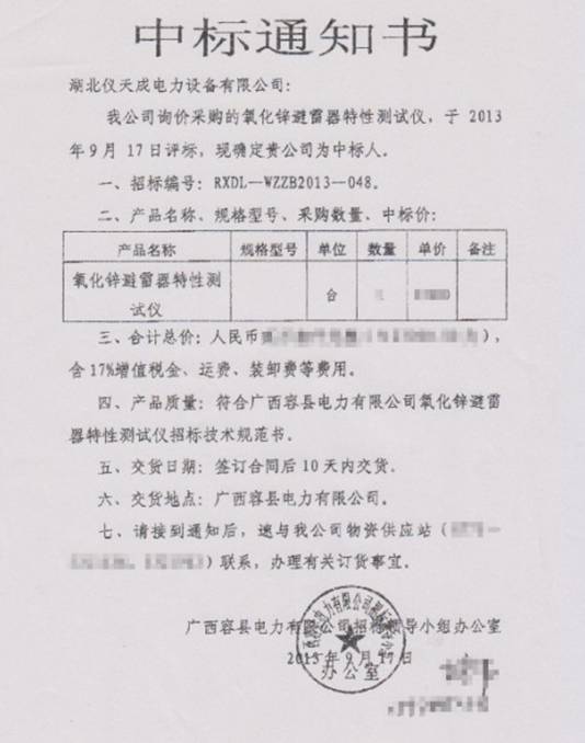 主題詞:廣西容縣電力 廣西水利電業集團 儀天成電力氧化鋅避雷器 中標通知書