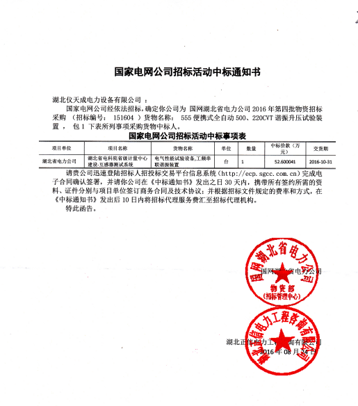 2016年9月,湖北儀天成電力設備有限公司再次捷報頻傳:我公司在國家電網公司的設備采購招標中,從眾多供應商中脫穎而出,一舉中標!
