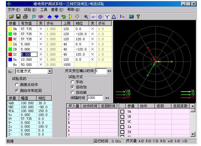 YTC1000微機(jī)繼電保護(hù)測(cè)試儀單欄中常用的菜單項(xiàng),在各個(gè)測(cè)試模塊中其名稱或符號(hào)相同,定義的意義和功能也基本相同。這里以“交流試驗(yàn)”模塊為例進(jìn)行介紹,可以適用于后面介紹的各個(gè)功能模塊。界面如下圖所示: