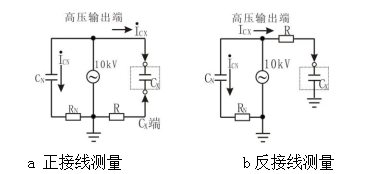 按被測(cè)試品是否接地分兩種測(cè)量方式,即正接線測(cè)量方式和反接線測(cè)量方式。兩種測(cè)量方式的原理如圖所示: