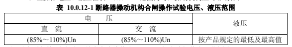1)當(dāng)操作電壓、液壓在表 10.0.12-1 范圍內(nèi)時(shí),操動(dòng)機(jī)構(gòu)應(yīng)可靠動(dòng)作;