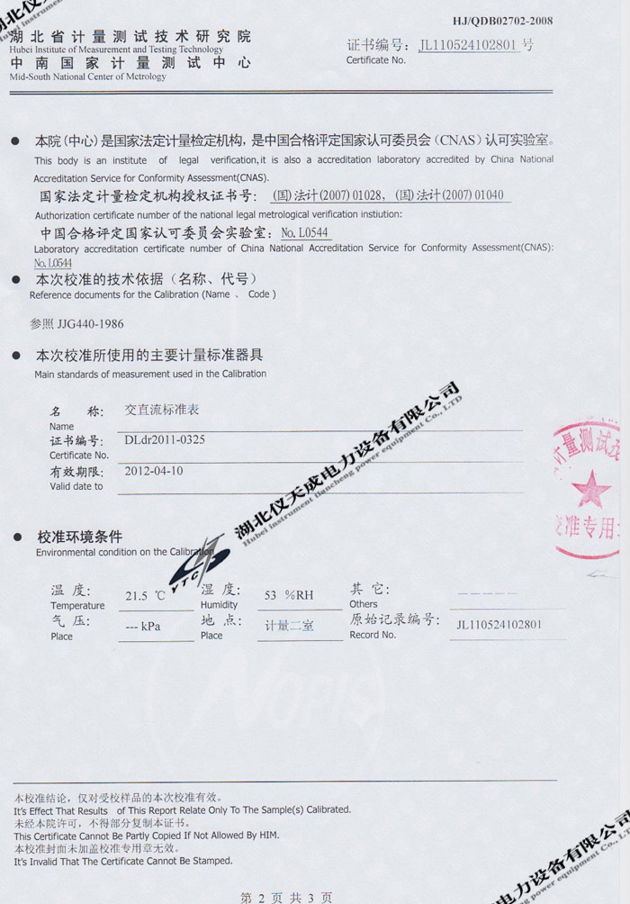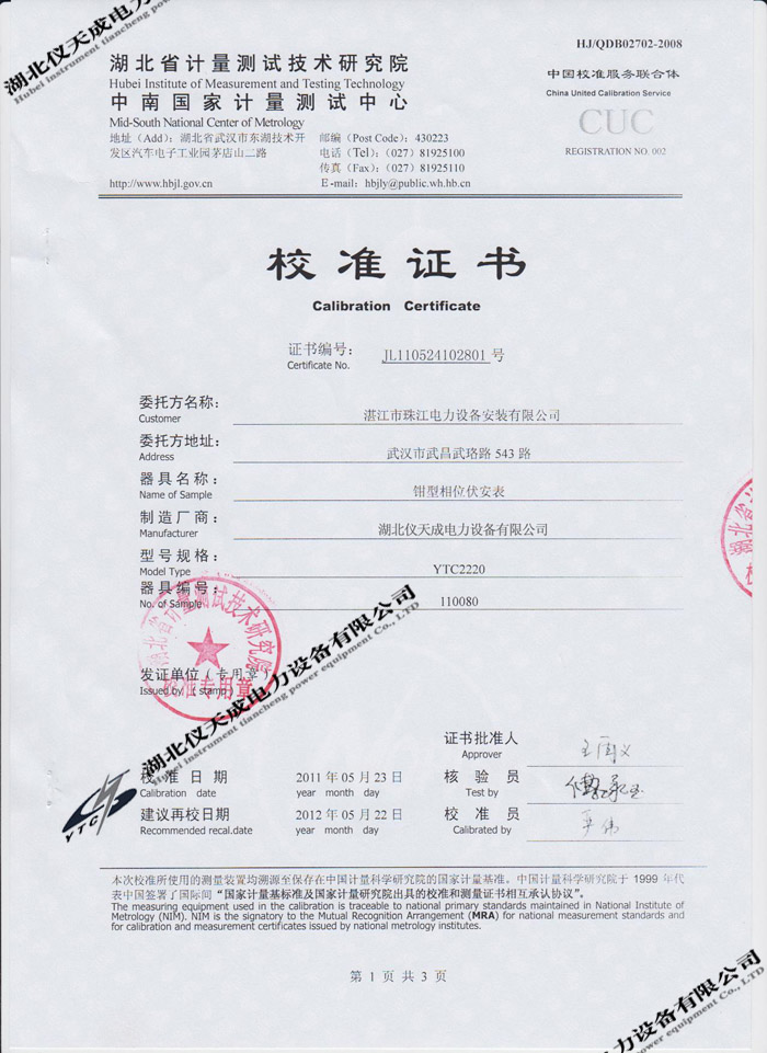 轉(zhuǎn)載:"YTC2220數(shù)字雙鉗相位伏安表的資質(zhì)證書" 請注明來源于儀天成電力。 更多技術問題請致電儀天成電力客戶服務:027-87876585,技術部專線:027-87876585,在線客服:719388481