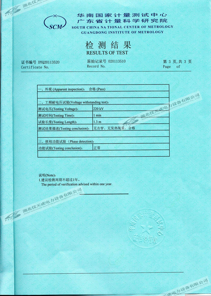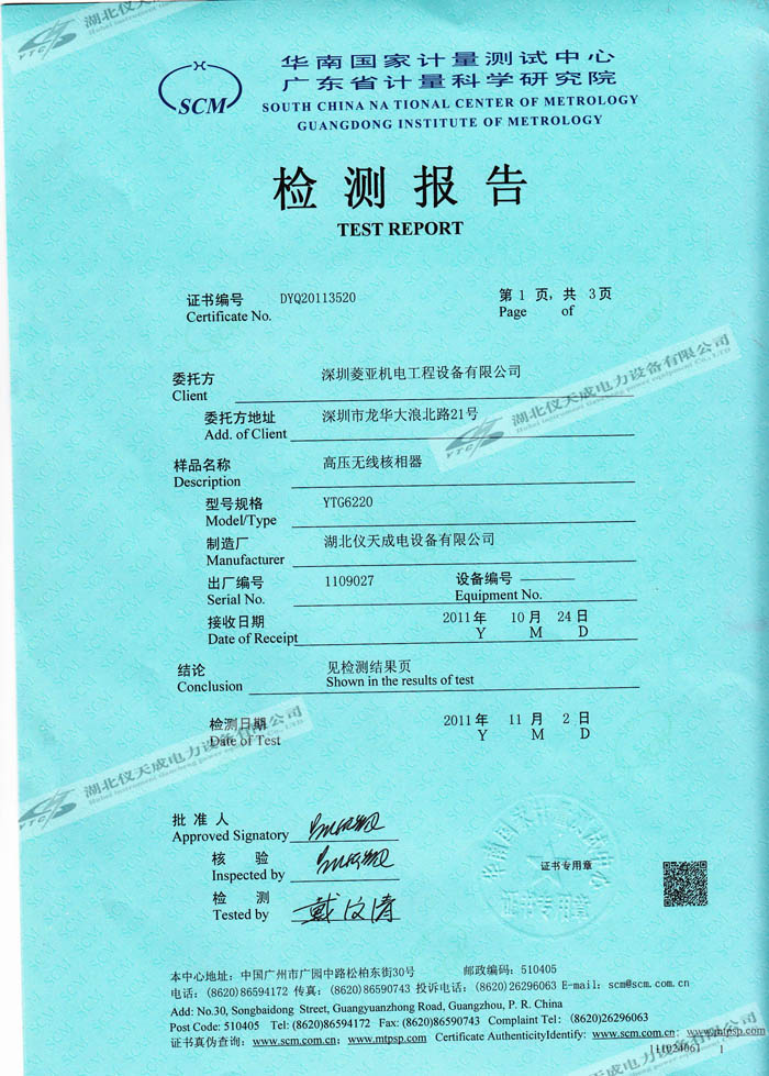 轉(zhuǎn)載:"YTC6220高壓無(wú)線核相器的資質(zhì)證書(shū)" 請(qǐng)注明來(lái)源于儀天成電力。 更多技術(shù)問(wèn)題請(qǐng)致電儀天成電力客戶服務(wù):027-87876585,技術(shù)部專(zhuān)線:027-87876585,在線客服:719388481